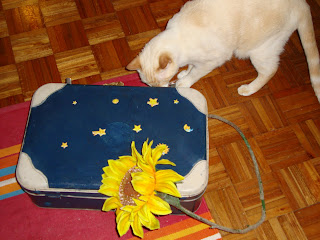 Cheirou o girassol, mas não me parece que tenha gostado. Agora, entrar dentro da mala... isso sim, já era outra história! Parece ser o único a não apreciar a caixinha de música, que entretanto começou a tocar, pois levantou logo as orelhas como quem não gostou da coisa...